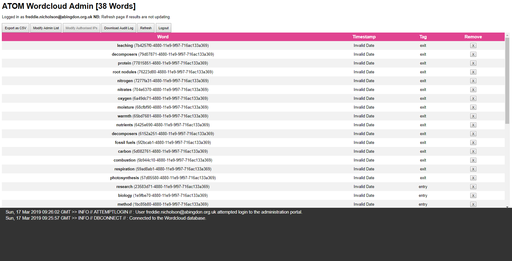 There is also an admin page for deleting nuisance words, exporting the data to csv (excel):