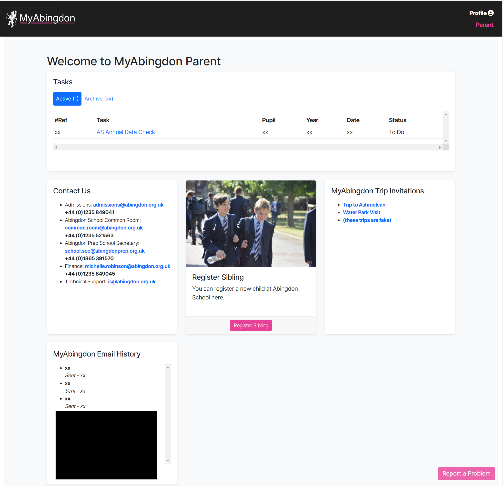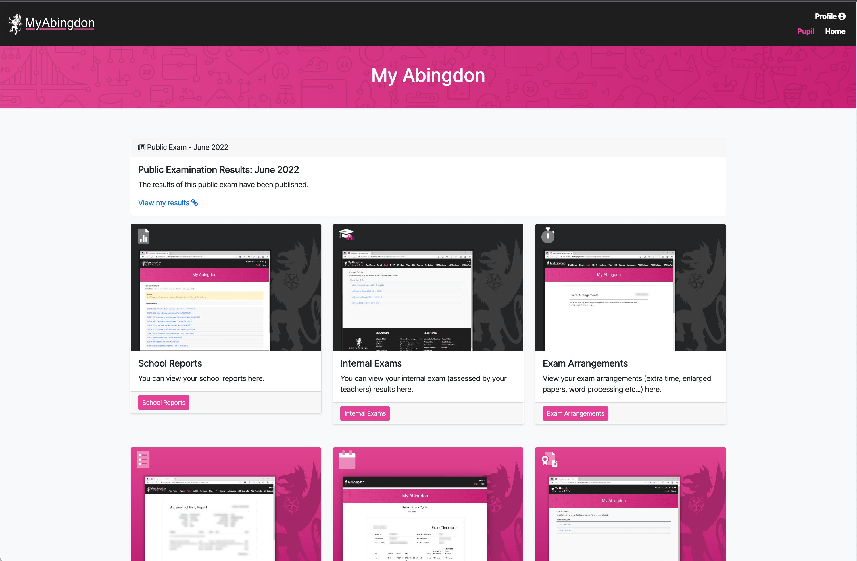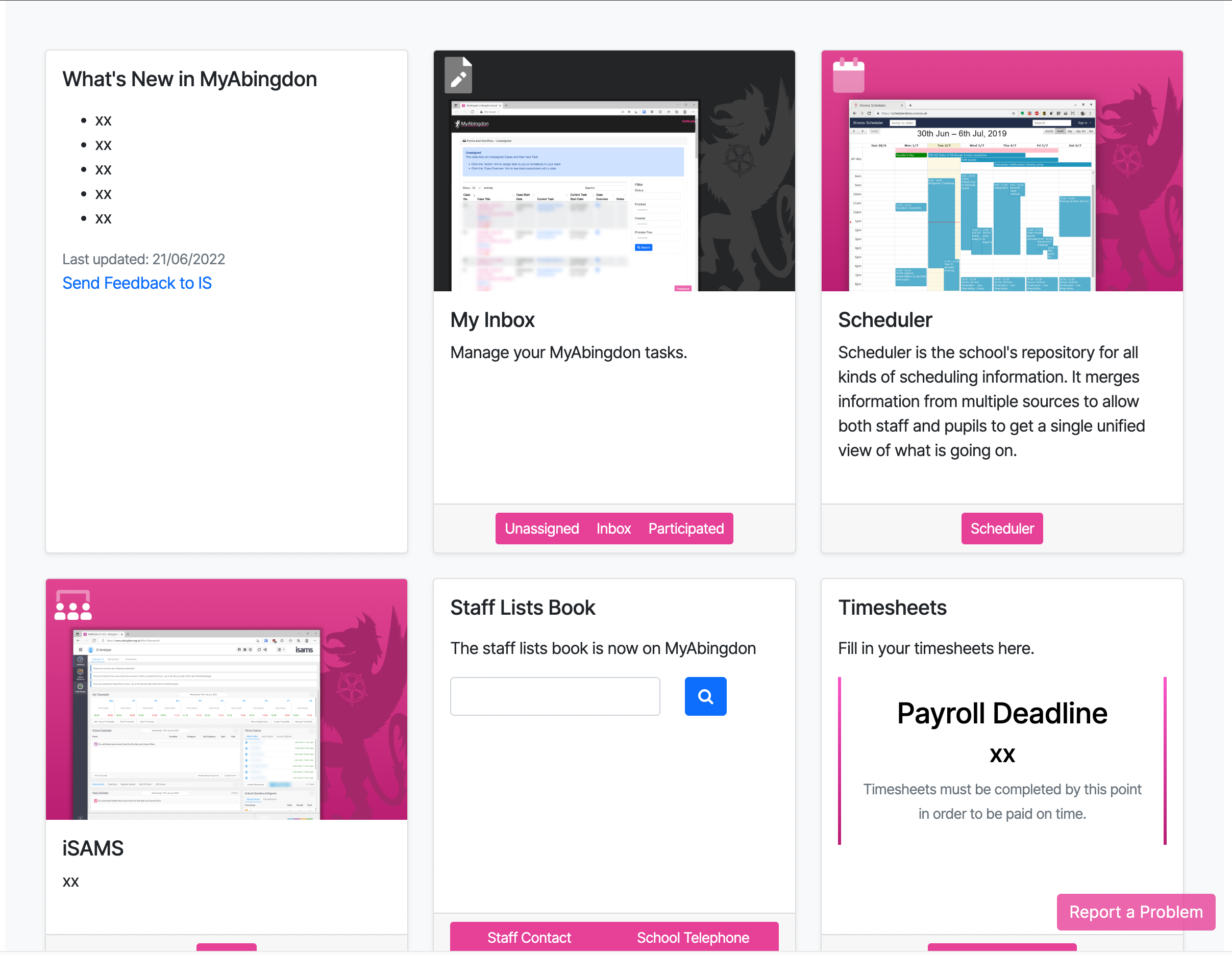 I redesigned every home page for Staff, Pupils and Parents to use a dynamic widget style dashboard. Each 'widget' can have buttons appended to it which performs a certain action. Widgets could also have custom HTML allowing for simple features such as searching the internal directory or displaying a deadline. Each tile could also be only assigned to a certain user group so departments would only see the applications that are relevant to them.