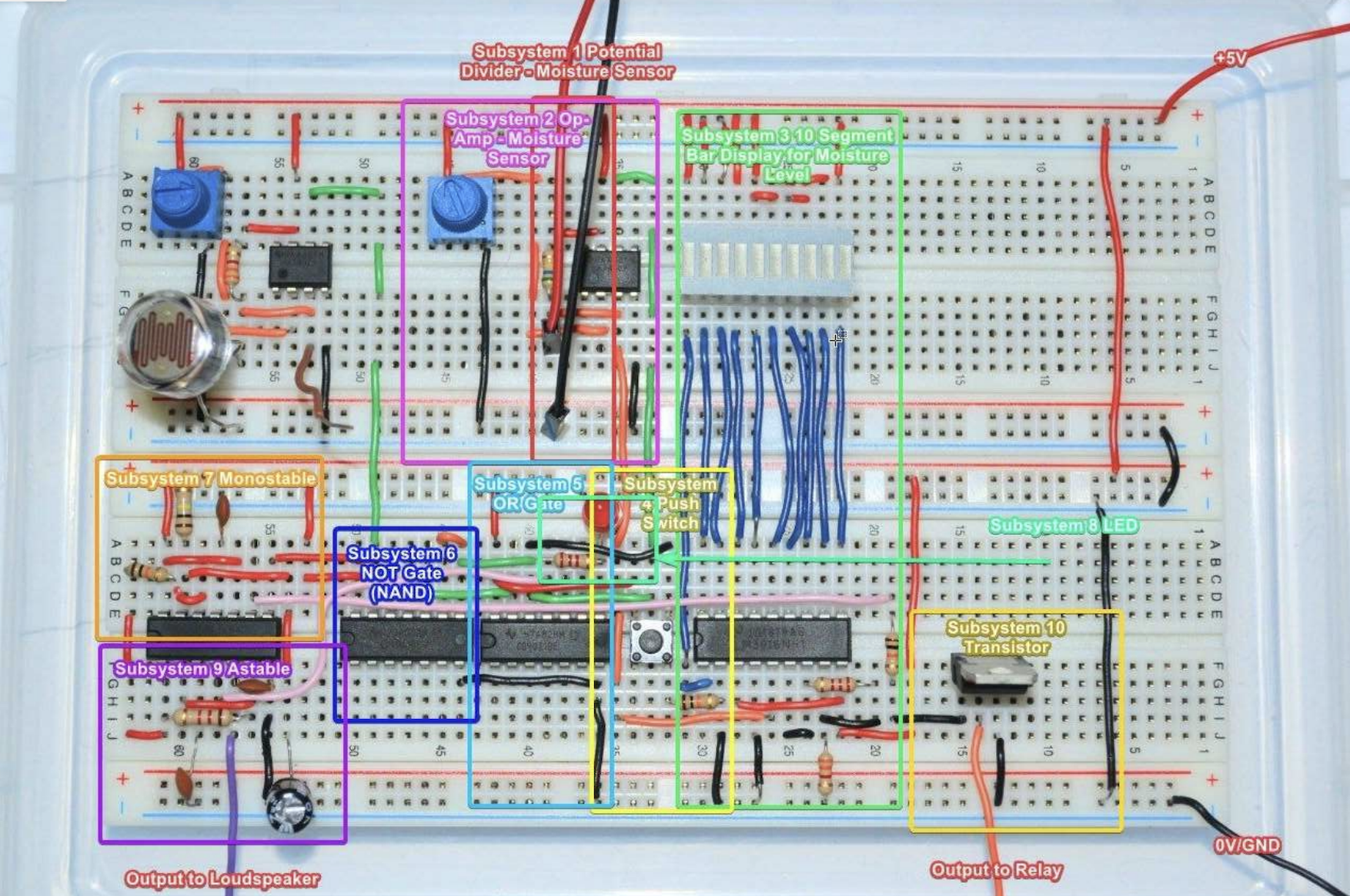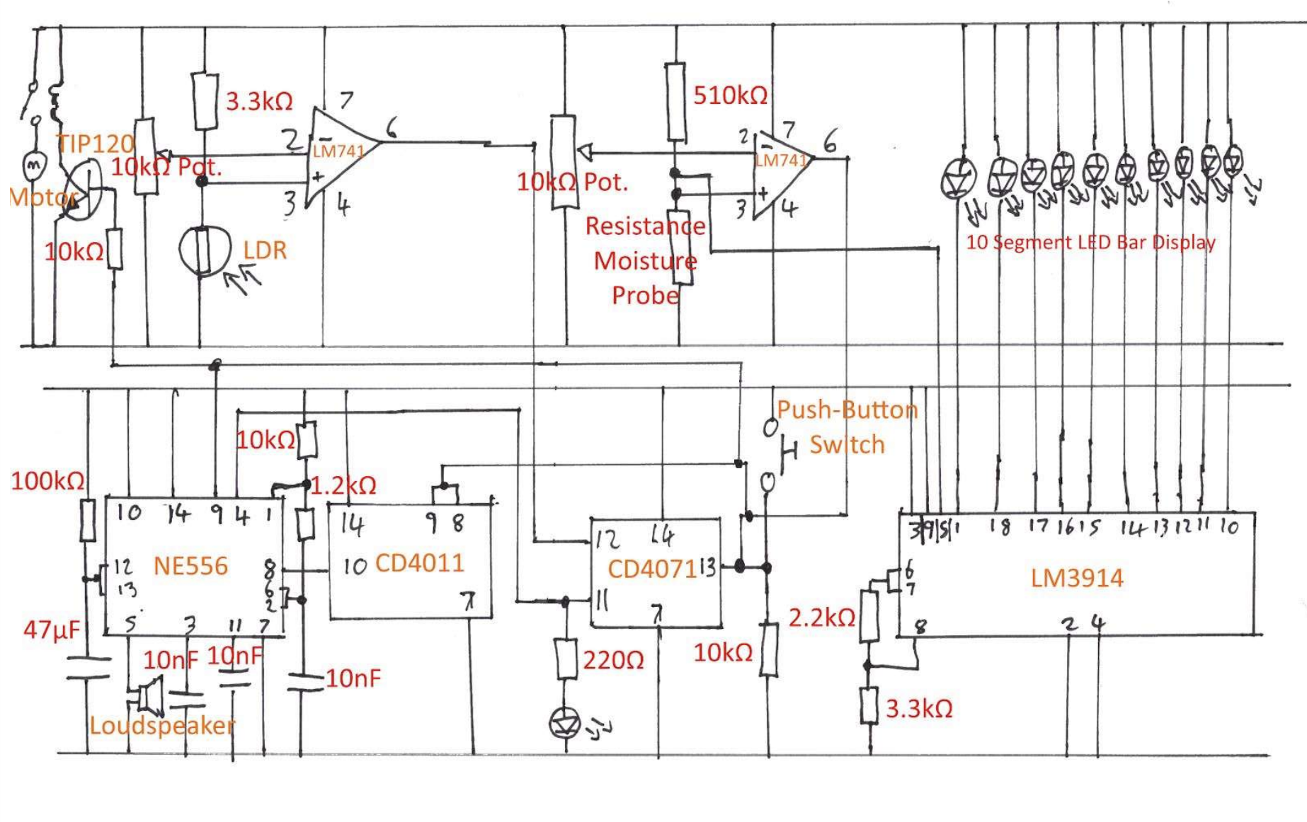My Electronics coursework was also plant based. Although similar to the 'Biology Plant Monitor' project it was not allowed to use any kind of microcontroller. Instead more barebones microchips were used to perform a similar function. It had an alert if the plant needed water, a moisture level indicator, adjustable settings and a test function.