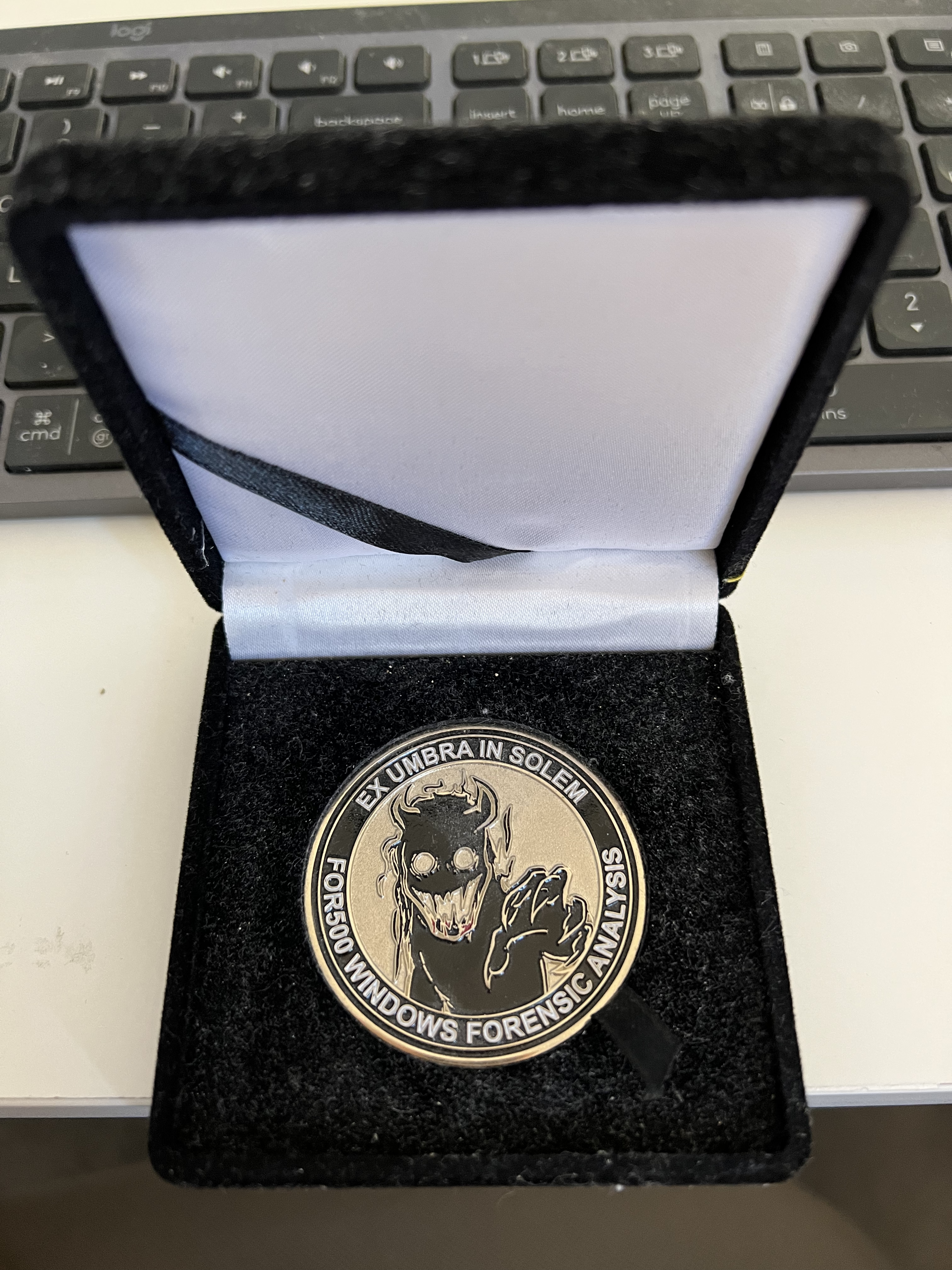 Our team won the final forensics challenge were we had to track down how an event had unfolded using digital tools to extract from an image of a computer. This led to me being given a SANS 'lethal forensicator' coin and being listed on the hall of fame: