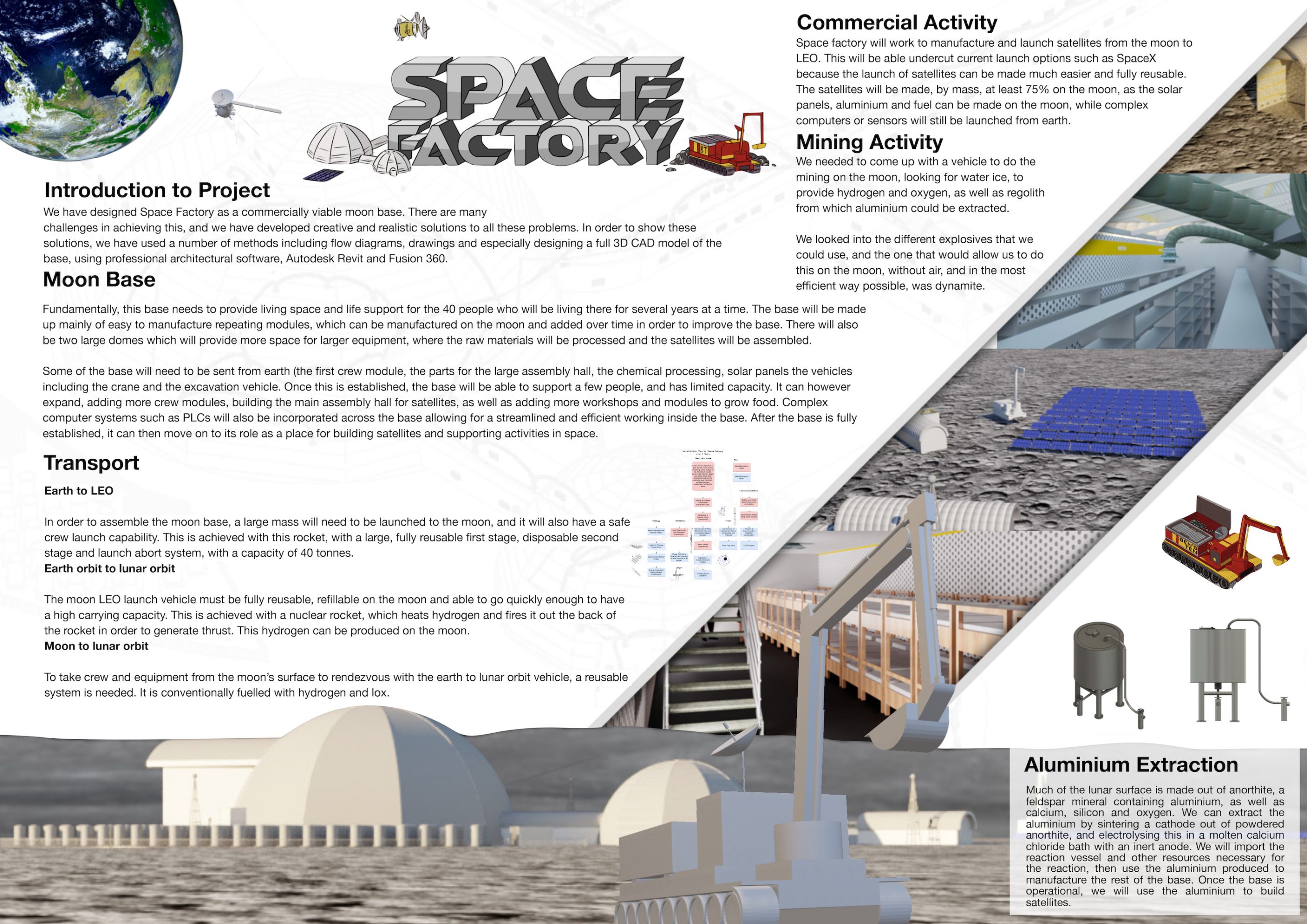 I was responsible for the overall base design and the electronics using professional CAD packages to convey my final ideas. Throughout the project I researched materials and their properties such as Regolith, used for radiation shielding to the Ku bands used by astronauts today to make communications back to Earth with investigations into the protocols of 5G.